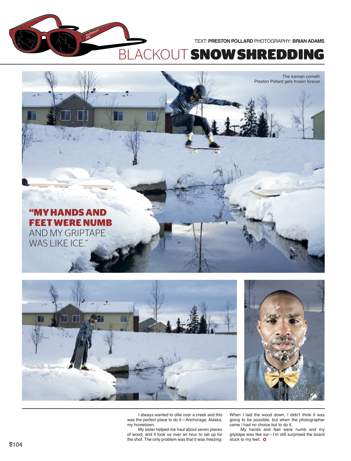 This week Preston Pollard is featured in this photo taken by Brian Adams in Alaska and printed in The Skateboard Mag.