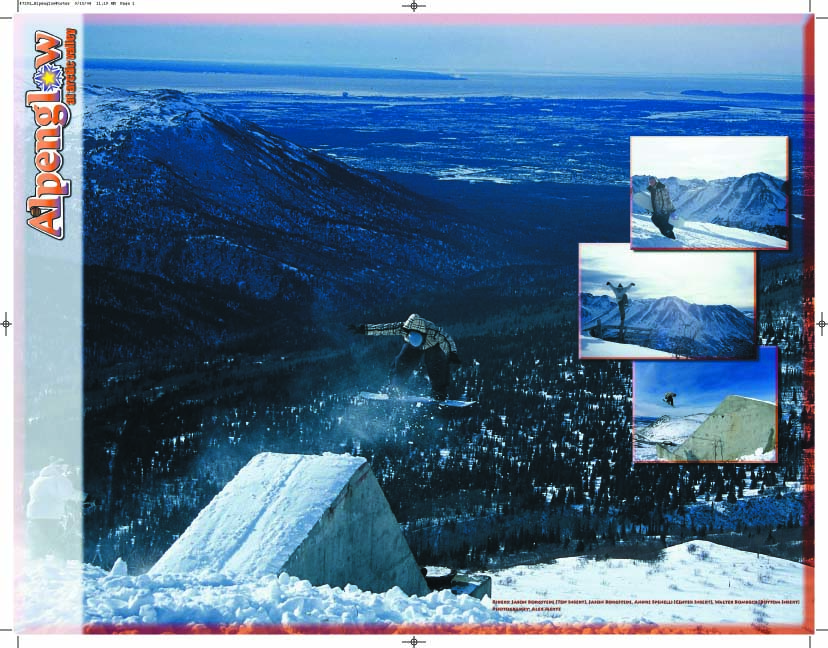This is not the traditional magazine shot but the rules are somewhat loose here. As long as it’s been in print then it works. This was the promotional poster printed up for Alpenglow when they sponsored my movie “Nice! Gordon.” The main shot and the first of the three stacked photos are of myself. The karate kid is Andre Spinelli and the stylish backside 180 is Walter Bombeck. All the shots were taken by Alex “Lord have mertzy” Mertz. And only I can take credit for the ridiculous fake Burberry jacket.